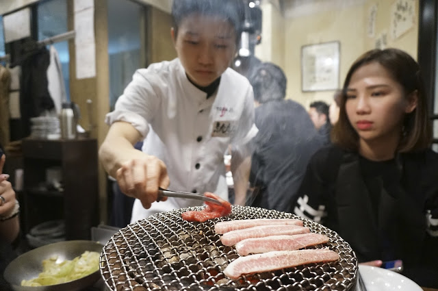 这位店员很用心在帮我们烧烤,所以我们都不用自己来。